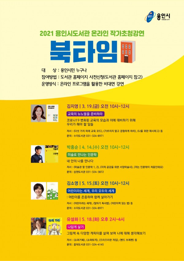용인시 서부도서관이 시민들의 코로나블루 극복에 도움이 되고자 온라인 작가초청강연회 ‘북타임’을 운영한다고 7일 밝혔다. 강연회는 오는 19일부터 5월 18일까지 총 4회에 걸쳐 화상회의 앱인 ‘줌(ZOOM)’을 통해 진행한다. 먼저 19일 수지도서관에서는 ‘미래 교육을 멘토링하다’의 저자인 김지영 작가가 ‘교육의 뉴노멀을 준비하라’를 주제로 강의한다. 김 작가는 코로나19로 급격하게 변화된 교육의 모습과 새로운 …