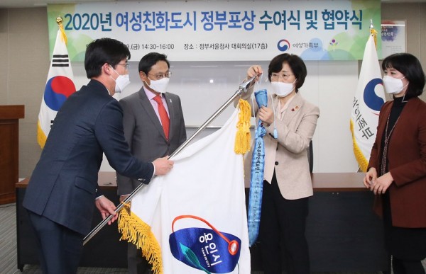 용인시가 29일 정부서울청사 대회의실에서 개최된 ‘2020 여성친화도시 정부포상 시상식’에서 국무총리상을 수상했다. 여성가족부는 여성의 안전을 보장하고 사회·경제적 참여를 지원하는 지방자치 단체를 여성친화도시로 지정하고 있으며 매년 성과가 좋은 지자체를 선발해 표창하고 있다. 현재 시를 비롯해 96개 지자체가 지정돼 다양한 여성친화정책을 수행하고 있다. 시는 지난 2013년 여성친화도시에 지정된 이후 시…