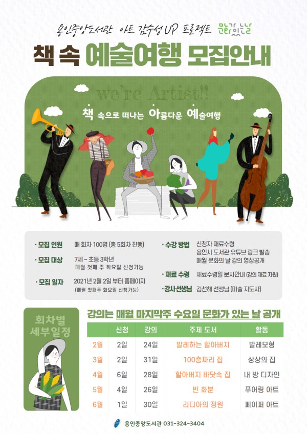 용인중앙도서관은 코로나19로 지친 아이들을 위한 온라인 프로그램 ‘아트 감수성 UP 프로젝트-책 속 예술여행’을 운영한다고 31일 밝혔다. 2월부터 6월까지 매월 마지막 주 수요일 문화가 있는 날에 진행될 책 속 예술여행은 코로나19로 지친 아이들에게 책과 함께 다양한 예술 장르를 만날 수 있는 기회를 제공하기 위해 마련했다. 7세 이상부터 초등학교 3학년까지의 어린이를 대상으로 운영하며, 선정된 책을 읽고 책 속…