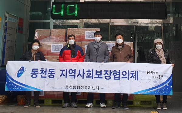 용인시 수지구 동천동은 26일 지역사회보장협의체가 홀로 어르신 등 생활이 어려운 55가구에 식품 꾸러미를 전달했다고 밝혔다. 각 꾸러미는 즉석밥, 생필품 등이 들어 있다. 55개 꾸러미 준비로 약 440만원이 사용됐으며, 이웃돕기성금 동 예치금으로 마련했다. 이날 지역사회보장협의체위원, 직원 등은 4명씩 조를 나누어 대상 가정을 방문해 물품을 전달하며 어르신들의 안부를 살폈다. 이정열 지역사회보장협의체 민간위원…