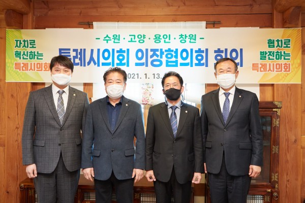 용인시의회 김기준 의장은 13일 오전 11시 수원전통문화관 제공헌에서 열린 4개 특례시의회 의장협의회 회의에 참석했다. ○ 이날 김기준 의장을 비롯해 조석환 수원시의회 의장, 이길용 고양시의회 의장, 이치우 창원시의회 의장 등이 참석한 가운데 지방자치법 개정에 따른 4개 특례시의회 협의체 구성과 특례시의회 권한 발굴을 위한 공동연구용역 추진 등에 대해 논의하는 시간을 가졌다. ○ 김기준 의장은 “용인시가 내년부터 특…