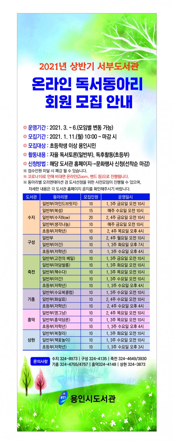 용인시 서부도서관은 22개 온라인 독서동아리에서 활동할 회원을 오는 11일부터 선착순으로 모집한다고 4일 밝혔다. 온라인 독서동아리는 코로나19로 인해 집에서 나오기 힘든 시민들에게 온라인으로 독서 체험의 기회를 제공하고 독후 활동을 통한 문화역량을 함량하기 위해 기획했다. 독서동아리는 수지 ‧ 구성 ‧ 죽전 ‧ 기흥 ‧ 흥덕 ‧ 상현 등 서부도서관 소속 6개 도서관에서 일반부 165명, 초등부 60명 등 총 23…