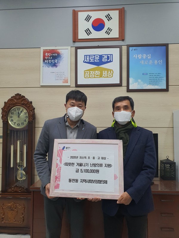 용인시 수지구 동천동은 24일 지역사회보장협의체가 저소득층 학생들에게 방한용 외투 17벌을 전달했다고 밝혔다. 전달된 물품은 이웃돕기성금 동 예치금으로 마련했으며, 이를 관내 저소득층 초·중·고등학생 17명에게 전했다. 이정열 지역사회보장협의체 위원장은 “관내 소외 계층 학생들이 따뜻한 겨울을 보냈으면 좋겠고, 도움이 필요한 분들이 복지혜택을 누릴 수 있도록 더 노력하겠다”라고 말했다.