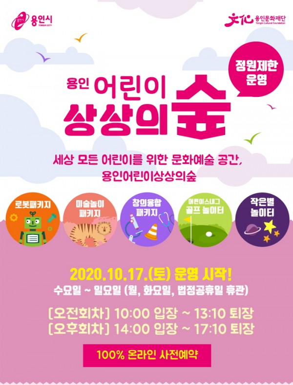 (재)용인문화재단(이사장 백군기) 용인어린이상상의숲(이하 상상의숲)은 코로나19로 인한 휴관을 종료하고 오는 17일(토)부터 재개관한다. 지난 11일(일) 중대본의 사회적 거리두기 1단계 하향 발표에 따라 온라인 사전 예약을 통한 정원 제한(1인당 거리두기 공간 확보 및 평균 관람객수 50% 미만 종합 고려) 방역안전관리 시스템으로 운영된다. 지난 7~8월 상상의숲 특별운영 기간 인터파크 아동・가족체험 부문 티켓 판매 1…