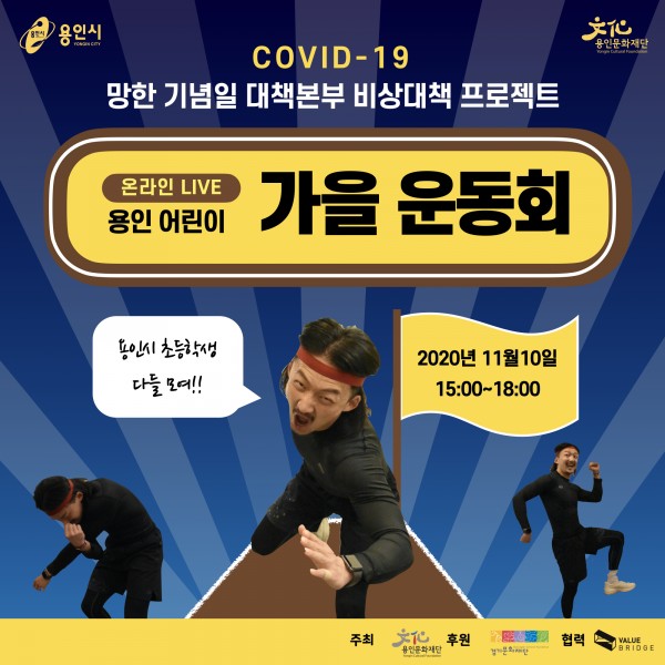 (재)용인문화재단(이하 ‘재단’)은 코로나19로 가을운동회 운영이 보류된 용인시에 소재한 초등학교의 재학생을 대상으로 ‘온라인 가을 운동회’를 오는 11월 10일(화) 개최한다. 이번 행사는 용인문화재단에서 양성하는 문화예술매개자 ‘아트러너’의 공동체 예술 프로젝트로 추진되며, 용인시 어린이들이 코로나19로 인해 느끼는 우울감을 공감하고 일상 회복을 지원하려는 의도에서 기획됐다. 온라인 가을 운동회는 유튜브 라…
