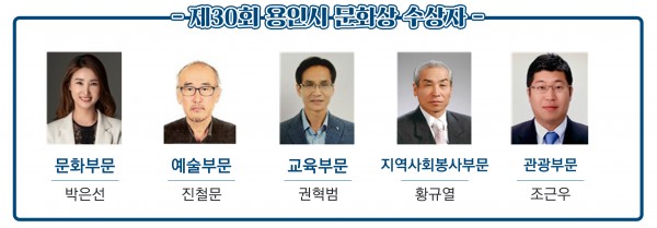 용인시는 24일 향토문화 전승과 지역사회 발전에 기여한 사람에게 수여하는 ‘제30회 용인시 문화상’ 5개 부문 수상자를 선정했다고 밝혔다. 수상자는 문화 부문에 박은선 문화네트워크 혜윰 대표, 예술 부문 진철문 동국대 문화예술대학원 객원교수, 교육 부문에 권혁범 언남초등학교 교장, 지역사회봉사 부문에 황규열 백암반계숭모회 회장, 관광 부문에 조근우 청계목장 대표 등이다. 시는 지난 6~8월 공모를 통해 시 문화 창달…