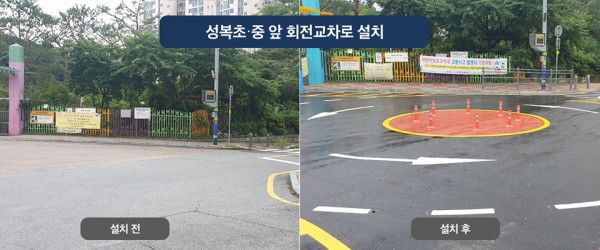 용인시 수지구는 7일 학생들의 안전을 위해 성복동 성복초‧중학교 교문 앞에 회전교차로를 설치했다고 밝혔다. 두 학교가 인접해 많은 학생들과 차량이 통행하는 구간임에도 차량 회차공간이 협소해 정체는 물론 통행 안전에도 문제가 많았기 때문이다. 학교측은 지난 5월 백군기 용인시장이 학생들의 등교 상황을 살피기 위해 학교를 방문했을 때 이 같은 문제를 호소하며 교통개선을 건의했다. 이에 구는 학교 측과 협의해 보도의…