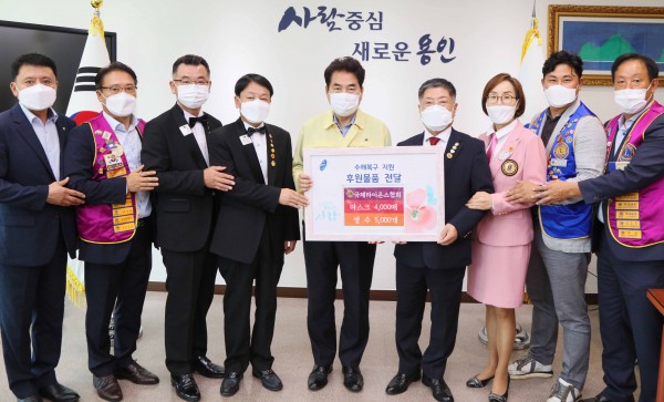용인시는 24일 김의겸 국제라이온스협회 총재와 임직원들이 시를 방문해 수해 복구에 애쓰는 봉사자들에게 전해달라며 500만원 상당의 마스크와 생수를 기탁했다고 밝혔다. 김의겸 총재는 “집중호우로 피해를 입은 원삼과 백암지역의 수해 복구를 위해 많은 자원봉사자들이 구슬땀을 흘리며 노력하고 있어 조금이나마 도움이 되었으면 하는 마음으로 회원들과 마련한 물품”이라고 말했다. 백군기 용인시장은 “어려운 시기에 국제라이온스협회…