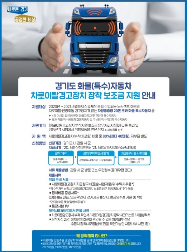 경기도가 신규제작·조립·수입된 총중량 20톤 초과 화물(특수)자동차를 대상으로 ‘2020년도 차로이탈경고장치 장착지원 사업’을 추진한다.‘차로이탈경고장치 장착지원 사업’은 차로이탈 및 전방추돌을 감지해 경고하는 장치를 차량에 장착하게 함으로써, 졸음운전 등 대형 화물(특수) 자동차 운전자 부주의로 대형 교통사고를 예방하고자 추진하는 사업이다.앞서 도는 지난 2018년과 2019년 2년간 총 1만…