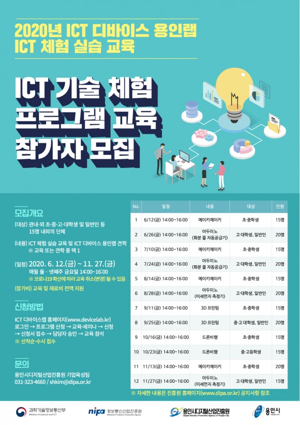 용인시디지털산업진흥원(원장 김병현)이 2020년 ICT 체험 실습 교육 참가자를 모집한다. 6월부터 11월까지 매달 2회씩 총 12회 차로 진행되는 이번 프로그램은 코로나19로 인해 관내/외 초ㆍ중ㆍ고ㆍ대학생 및 일반인 단체를 15명으로 인원 제한하여 모집하며, 각 회차별로 선착순 모집한다. 이 프로그램은 사물인터넷 신산업 육성선도 사업(과학기술정보통신부)의 일환으로 4차 산업혁명 시대 핵심 기술인 ICT 분야의 체험…