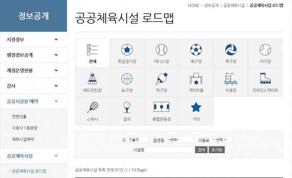 용인시는 28일 시 홈페이지에 관내 모든 공공체육시설의 정보를 한눈에 확인할 수 있는 제공하는 로드맵을 구축했다고 밝혔다. 그동안 유사한 시설임에도 관리 기관이 달라 관련 정보, 예약 등의 서비스를 별도 운영했던 것을 시 홈페이지에 통합해 시민들이 편리하게 이용할 수 있도록 한 것이다. 시 홈페이지에 메인 화면에서 상단 중앙 ‘정보공개’를 클릭하면 하위 카테고리 맨 아랫부분에 공공체육시설 로드맵이 있다. 이…