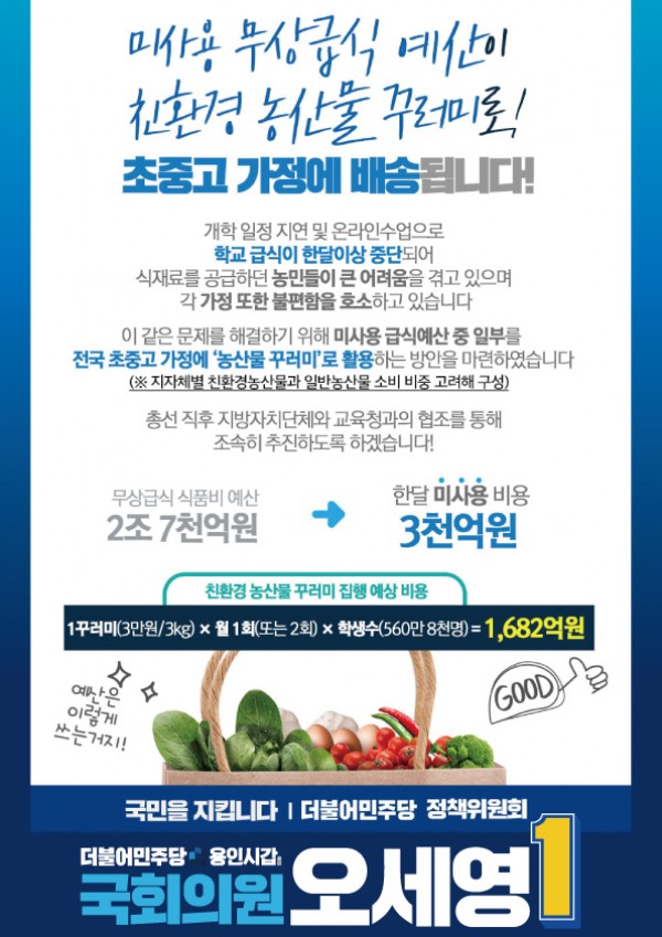 □ 오세영 더불어민주당 용인시갑 국회의원 후보가 11일 미사용 무상급식 예산으로 친환경 농산물 꾸러미를 초중고 가정에 배송하는 방안에 대하여, 지방자치단체와 교육청의 협조를 통하여 조속히 추진해야 한다고 밝혔다. □ 오세영 후보는 “개학 일정 지연 및 온라인수업으로 학교 급식이 한 달 이상 중단되어 식재료를 공급하던 농민들께서 큰 어려움을 겪고 있으며 각 가정 또한 불편함을 호소하고 있다. 더불어민주당 정책위원회에서 이 …
