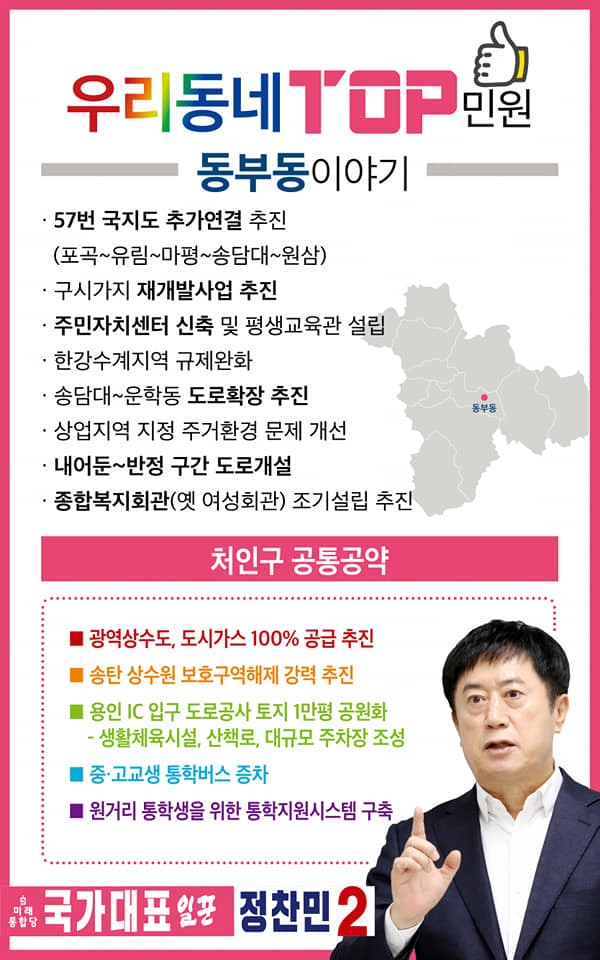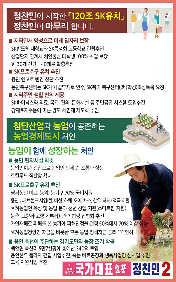 “농업인 지원제도를 대폭 확대하고, 처인지역에 상수도, 도시가스 100% 보급을 추진하겠습니다.” 미래통합당 용인갑 국회의원 후보인 정찬민 전 용인시장은 12일 처인구가 도농복합도시인 점을 감안, 기반시설이 부족한 농촌지역에 대해 상수도, 도시가스 100% 공급을 추진하고 농업인 지원을 대폭 늘리기로 했다고 밝혔다. 특히 도시가스의 경우 처인구 읍면지역은 경제성이 낮다는 이유로 보급률이 낮아 주민들이 큰 불…