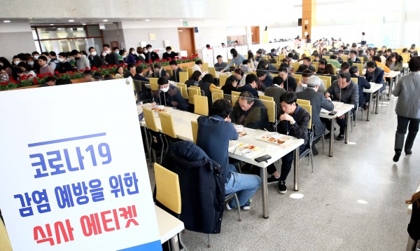 용인시 직원들이 16일 코로나19 예방을 위해 가림막이 설치된 시청 구내식당에서 2교대로 점심을 먹고 있다. 시는 직원들이 마주보며 밥을 먹는 동안 비말감염에 노출되지 않도록 이날 아크릴 소재의 가림막 72개를 설치했다. 한편, 시는 집단감염을 예방하기 위해 11곳의 출입문 가운데 3곳만 개방하고 열화상카메라나 비접촉온도계로 모든 방문객의 체온을 체크하고 있다.