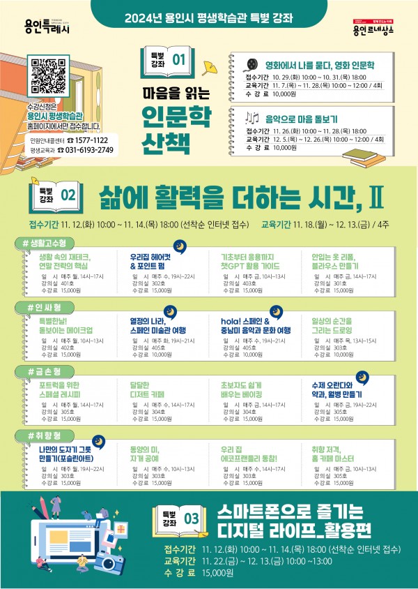 용인특례시(시장 이상일)는 평생학습관(수지)이 ‘삶의 활력을 더하는 시간, Ⅱ’를 주제로 마련한 특별강좌 수강생을 모집한다고 12일 밝혔다. 시는 ▲ ‘생활 고수형’ (생활 속의 재테크 연말 전략 핵심, 우리집 헤어컷& 포인트 펌, 기초부터 응용까지 챗 GPT 활용 가이드, 안 입는 옷 블라우스 만들기) ▲ ‘인싸형’(특별한 날! 돋보이는 메이크업, 열정의 나라 스페인 미술관 여행, hola! 스페인&중남미 음악과 문화 …