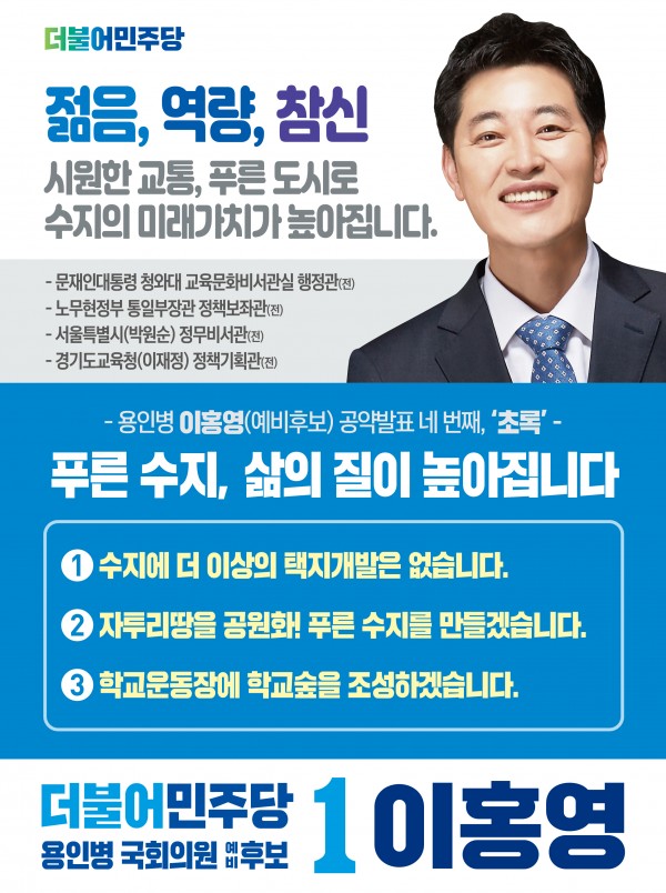 이홍영 더불어민주당 용인병 예비후보가 19일“수지에 더 이상의 택지개발을 중단하고, 자투리땅을 최대한 공원화해 쾌적한 푸른 수지를 만들겠다”는 초록(환경)공약을 발표했다. 이 예비후보는 택지개발 중단을 공약으로 내세운 것에 대해“수지 시민들의 가장 큰 요구 중에 하나는 바로 쾌적한 수지에 대한 요구다. 더 이상의 택지개발 허가를 중단하고, 산책하고 싶은 푸른 공원을 많이 만들어 도시의 자긍심과 시민의 삶의 질을 높…