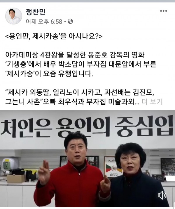 ‘용인판 제시카송을 아시나요?’ 자유한국당 용인갑 국회의원 예비후보인 정찬민 전 용인시장이 지난 12일 자신의 페이스북에 봉준호 감독의 영화 ‘기생충’에 나오는 ‘제시카송’을 패러디한 선거홍보 동영상을 올려 화제다. 정 전 시장이 만든 ‘제시카송’은 “채무제로 달성한 용인아들 정찬민, 빚더미 용인시 구해낸 일꾼, 그래서 용인엔 정찬민이 필요해”라는 내용으로 개사해 김상수 용인시의원과 함께 찍었다. 정 전 시…