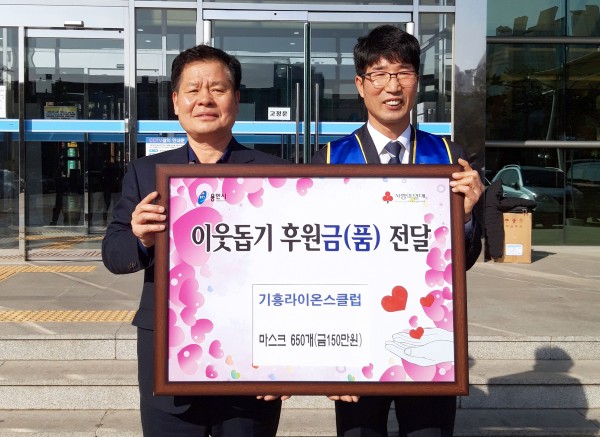 용인시 기흥구는 11일 기흥라이온스클럽서 신종 코로나바이러스 예방을 위해 관내 저소득층에 전해 달라며 150만원 상당의 마스크 650장을 기탁했다고 밝혔다. 이날 기탁한 마스크는 회원들이 십시일반 성금을 모아 마련한 것으로 감염병 취약계층인 어르신을 비롯한 관내 저소득 이웃들에게 전달할 예정이다. 서강원 기흥라이온스클럽 회장은 “신종 코로나바이러스로 불안이 커지는 가운데 저소득층 이웃들이 감염병을 예방하도록 돕기 위…