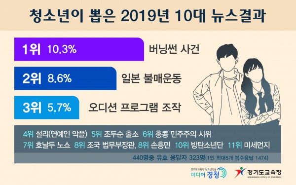 경기도교육청(교육감 이재정)이 21일 수원 화홍고등학교에서 열린 도교육청 청소년방송 ‘미디어경청’ 송년 콘서트에서 ‘청소년이 뽑은 2019년 10대 뉴스’조사 결과를 발표했다. 조사결과 1위는 10.3%를 얻은 ‘버닝썬 사건’이 차지했다. 2위는 ‘일본 불매운동’으로 8.6%, 3위는 ‘오디션 프로그램 조작’5.7%로 나타났다. 10대 뉴스 가운데 ‘조두순 출소’ 5.1%로 5위, ‘홍콩 민주주의 시위’ 3.8%로 6위…