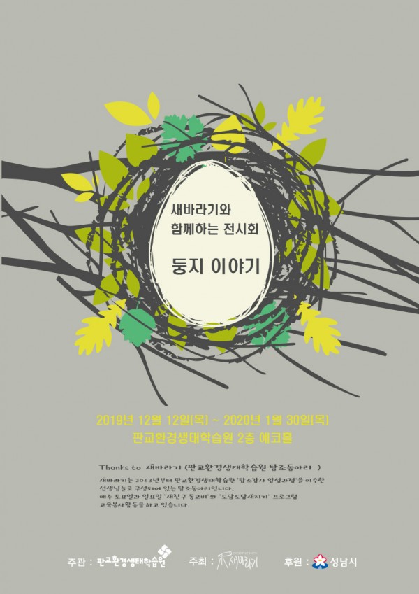 성남시 판교환경생태학습원은 2019년 12월 12일(목)부터 2019년 1월 30일(목)까지 「새바라기와 함께하는 둥지 이야기」 전시회를 개최한다. 2층 기획 전시실인 에코홀에서 열리는 ‘새바라기와 함께하는 둥지 이야기’ 는 판교환경생태학습원에서 자원봉사 활동으로 탐조 모니터링과 프로그램을 진행하는 탐조강사들이 성남시 화랑공원 일대를 비롯하여 전국 다양한 지역에서 2013년부터 탐조활동을 통해 찍은 사진들과 그린 세밀화…