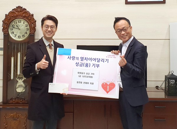 용인시는 11일 연말연시 이웃돕기 운동 ‘사랑의 열차 이어달리기’에 각계각층 시민들의 온정이 이어지고 있다고 밝혔다. 이날 용인건축사협회 김종기 회장 등 회원 4명이 시청을 찾아와 관내 저소득층을 지원하는 데 써 달라며 성금 350만원을 기탁했다. 이들은 지난 2015년부터 어려운 이웃을 위해 주거 취약계층의 집수리 지원 등 다양한 봉사와 나눔 활동을 펼치고 있다. 지난해에는 쌀 140포를 기탁한 바 있다. 같…