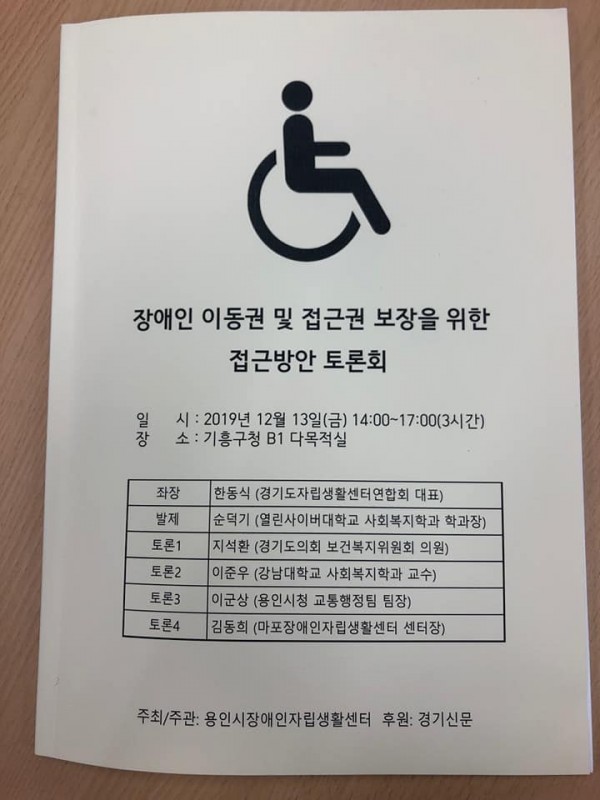 용인시장애인자립생활센터는 2019년 12월 13일 기흥구청에서 장애인 이동권 및 접근권보장을 위한 접근방향 이란 주제로 용인시 기흥구청 다목적실에서 토론회를 진행 하였다 용인시장애인자립생활센터 김정태사무국장은 이번 토론회는 예전에 비해 개선은 되었다고는 하나 여전히 장애인들의 이동권과 접근권은 장애인들이나 이동약자들에게 사회적 단절을 가져오는 걸림돌로 작용되고 있으며 장애인 이동권을 이야기 할 때 대부분의 자치단체는 교통약자…