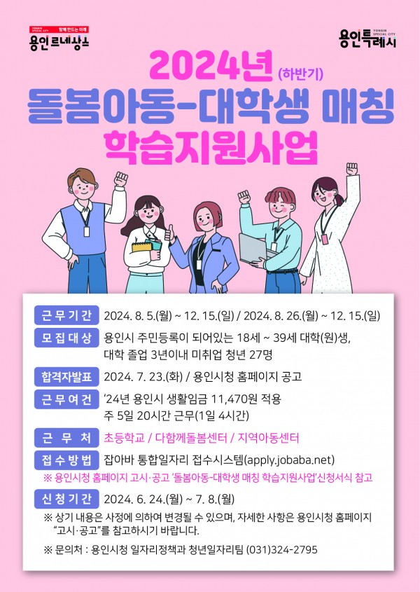 용인특례시(시장 이상일)는 다음 달 8일까지 지역 내 돌봄사각지대에 있는 아동을 위한 학습 도우미로 활동할 대학생 27명을 모집한다고 24일 밝혔다. 돌봄 사각지대에 놓인 아동과 시 거주 대학생을 연결해 청년에게는 전공과 적성을 살린 근무 경험을, 아동에게는 돌봄서비스를 제공하는 ‘돌봄 아동-대학생 매칭 학습지원’ 사업의 일환이다. 어린이 공부돌봄 대학생은 초등학교 돌봄교실, 다함께 돌봄센터, 지역아동센터 등에서 오…