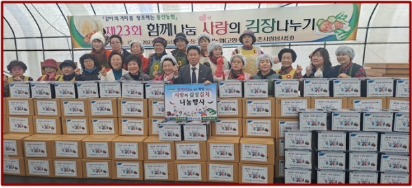 용인농협(조합장 김상용) 임직원은 지난 11월 17일에 용인시 고향주부모임(고향을 사랑하는 주부들 모임), 용인농협농촌사랑봉사단 등과 함께 송문리 절임배추농장에서 11월 16일부터 준비해온 ‘제23회 함께나눔 사랑의 김장김치 나누기’ 행사를 진행했다. 김장나누기 행사에서는 지역농업인이 재배한 배추 400포기와 재료 등으로 김장김치를 담가 취약계층, 장애인공동체, 용인청소년의집 등 사회복지시설, 지역 경로당 등에 전달…