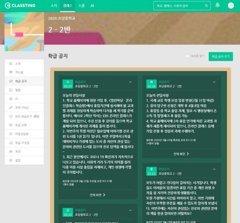 초당중학교, ‘우리집 온라인 클래스’ 운영 다양한 교과별 맞춤형 온라인 학습 실시 김경순 기자 2020-03-25 20:10 가 본문내용 확대/축소 본문 초당중학교, ‘우리집 온라인 클래스’ 운영초당중학교, ‘우리집 온라인 클래스’ 운영 초당중학교(교장 이경희)는 개학 연기에 따라 교사 관리형 ‘우리집 온라인 클래스’를 운영하고 있다. ‘우리집 온라인 클래스’는 3월 2일부터 4월 3일까지 5주간 실시되는 교사 관리형 비대면 원격 교육으로, 가정에서 실제 학교 수업에서와 같이 전 교과목 학습이 가능하도록 교과별로 온라인 콘텐츠 링크 또는 자체 제작 자료 등 다양한 유형의 온라인 학습 형태를 제공하고 온라인 상에서 매일 학습 과정을 확인하고 피드백을 부여하는 방식으로 진행되고 있다. 온라인 학습 운영을 위해 교과 교사는 학교 홈페이지의 교과별 자료방에 정기적으로 학습 안내와 학습 과제를 탑재하고 있다. 학생은 자료방의 링크와 학습지를 이용하여 학습을 실시하며(<사진1>) 학습 도중 궁금한 점을 질문방에 올리고 해당 교과 교사는 질의 내용을 처리하고 관련 내용 안내를 상시 업데이트하고 있다. 또한, 담임 교사는 클래스팅, 카톡, 밴드, 문자메시지 등의 SNS를 이용하여 매일 온라인 조회와 교과별 학습 안내를 실시하고(<사진2>), 오전 9시경 오후 4경 매일 두 차례씩 학습 여부를 확인하고 있으며, 유선으로 학생 개인별 학습 상담을 정기적으로 실시하여 가정에서의 온라인 학습 관리와 더불어 정서적 관리에도 힘쓰고 있다. 초당중학교(교장 이경희)는 개학 이후에 온라인 학습 내용을 수업 전개에 활용하고, 향후 구글 클래스룸 기반 스마트 교육을 실행하여 가정과 학교의 수업이 실시간으로 연관되어 학생 중심의 의미 있는 배움이 일어나도록 지원할 계획이다. < 참고 자료 사진 제공 > <사진1> ‘우리집 온라인 클래스’ 2학년 역사 교과 학습 장면 <사진2> 담임 교사 운영 온라인 학습 관리 플랫폼 장면 좋아요 0 싫어요 0 김경순 기자 기자의 다른기사 보기 목록 댓글목록 이전글 친환경 농산물 파는 드라이브 스루 마켓 20.03.25 다음글 안민석·김민기 후보 「분당선 기흥→오산 연장 추진하겠다」 공약 발표 20.03.25