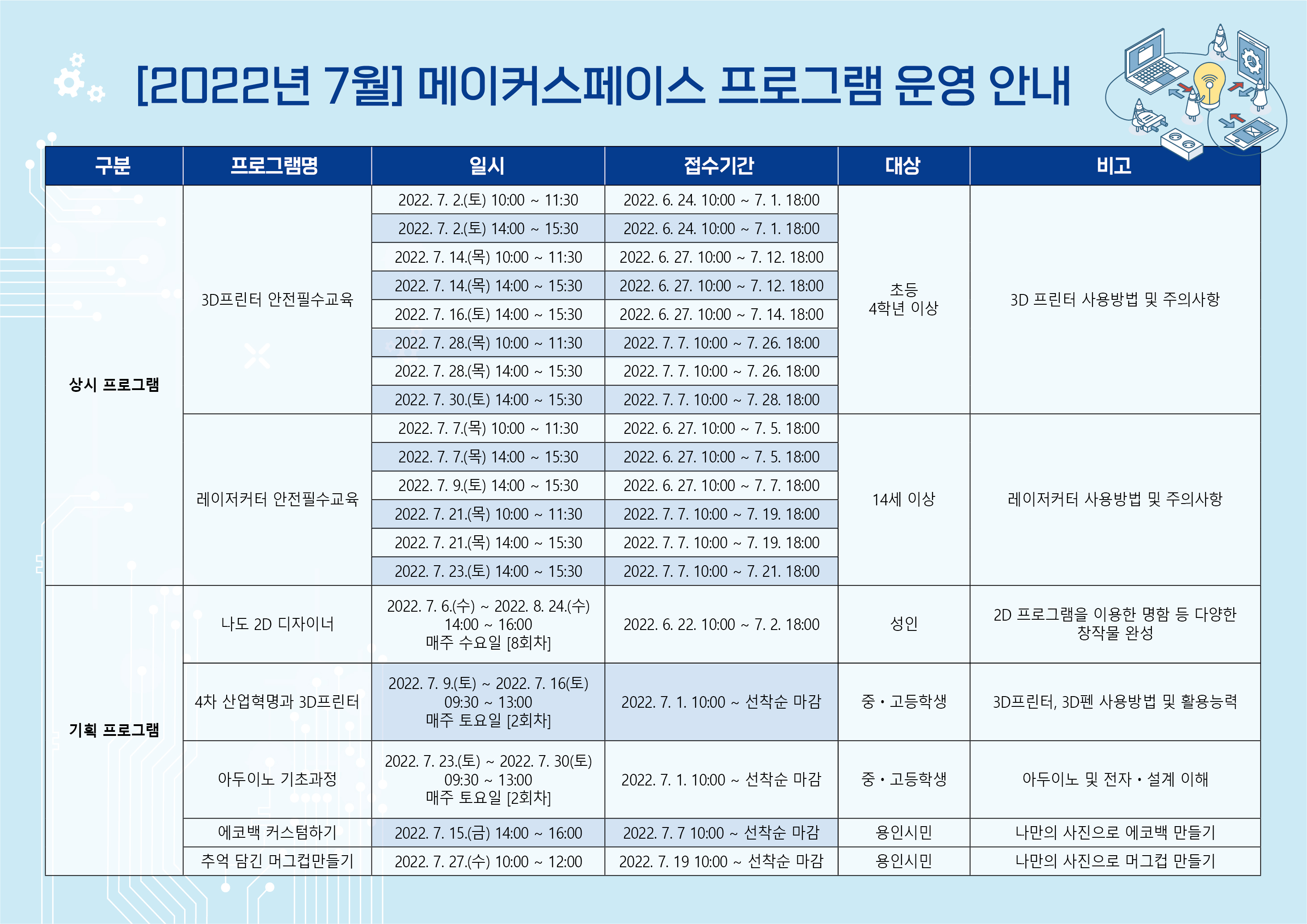 메이커 스페이스에서 나만의 디지털 창작물 만드세요 - 수지도서관, 3D프린터 사용법 등 7월 교육프로그램 7강좌 120명 모집 김경순 기자 2022-06-30 07:33 가 본문내용 확대/축소 본문 메이커 스페이스에서 나만의 디지털 창작물 만드세요 용인시 수지도서관이 메이커 스페이스 7월 교육 프로그램 참여 교육생 120명을 선착순 모집한다. 메이커 스페이스는 3D프린터 등 디지털 기술 기반 제조기기를 개방·공유해 이용자들이 창업과 교육을 위한 창작활동을 하도록 돕는 공간이다. 지난 4월 재개관한 수지도서관은 전국 공공도서관 최초로 디지털창작소를 마련, 이 안에 메이커스페이스와 함께 VR‧AR체험관, 미디어창작실을 운영하고 있다. 7월 교육에선 3D프린터 안전필수교육(7월 2일~7월 30일)과 레이저커터 안전필수교육(7월 7일~7월 23일) 등 상시프로그램을 진행한다. 또 2D프로그램으로 명함 등을 만드는 ‘나도 2D 디자이너’(7월 6일~8월 24일), 3D프린터와 3D펜 사용법을 알아보는 ‘4차 산업혁명과 3D프린터’(7월 9일~7월 16일), 아두이노 및 전자 설계 이해에 대한 ‘아두이노 기초과정’(7월 23일~7월 30일) 등 기획 프로그램도 준비했다. 사진을 담은 나만의 에코백이나 머그컵을 만드는 강좌도 각각 15일과 27일 진행된다. 초등 4학년 이상 용인시민이라면 누구나 참여 가능하며, 수지도서관 홈페이지(https://lib.yongin.go.kr/suji/)에서 신청 가능하다. 프로그램별 교육 일정과 대상, 재료비 등 세부 내용은 전화(031-324-8977/8975)로 문의하면 자세히 안내받을 수 있다. 도서관 관계자는 “4차 산업 혁명의 핵심 기술을 익혀 자신의 상상력과 아이디어를 구현하고자 하는 시민들이 이번 교육을 통해 진로‧취업에 도움이 되는 다양한 경험을 하기 바란다”고 말했다. 한편 지난 4월 수지도서관 개소 이후 1397명의 시민이 가상현실 체험 및 디지털 창작활동을 목적으로 디지털창작소를 다녀갔다. 수지도서관 일평균 이용자 수는 3209명이다. 좋아요 0 싫어요 0 김경순 기자 기자의 다른기사 보기 목록 댓글목록 이전글 축산 악취 저감 종합대책 시행 효과‘톡톡’…민원 대폭 감소 22.06.30 다음글 용인시, 대장금파크 기념품샵에서 지역 농특산물 전시·판매 22.06.30