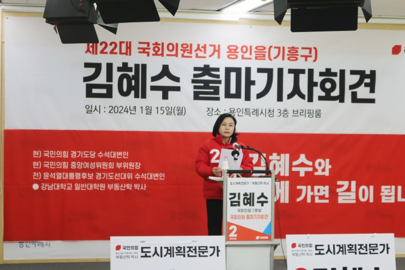 김혜수 국민의힘 예비후보 김경순 기자 2024-01-15 23:54 가 본문내용 확대/축소 본문 김혜수 국민의힘 예비후보 안녕하세요. 제22대 국회의원선거 용인시을 국민의힘 예비후보 김혜수입니다. 금일 10시30분 용인특례시청 3층 브리핑룸에서 진행한 출마기자회견을 했다. 오늘 김혜수 예비후보는 도시계획전문가로서 현 용인의 문제점을 가장 잘 진단할 수 있는 후보임을 역설했고, 용인을 예비후보 등록자들에게 TV토론을 통한 검증과정을 함께 받자고 제안했습니다. 부동산 전문가 용인의 발전에 앞장 설수있는 후보임을 강조했다. 2024년 1월 15일 용인시을 국회의원 예비후보 김혜수 좋아요 0 싫어요 0 김경순 기자 기자의 다른기사 보기 목록 댓글목록 이전글 용인특례시의회 의원연구단체 「용인특례시 바로알기2」, 지방재정의 혁신 방안 연구를 통한 경제 자족 도시 만들기 24.01.16 다음글 이상일 용인특례시장, “반도체 경쟁력 강화 위해선 경강선 연장 등 교통 인프라 확충돼야” 24.01.15