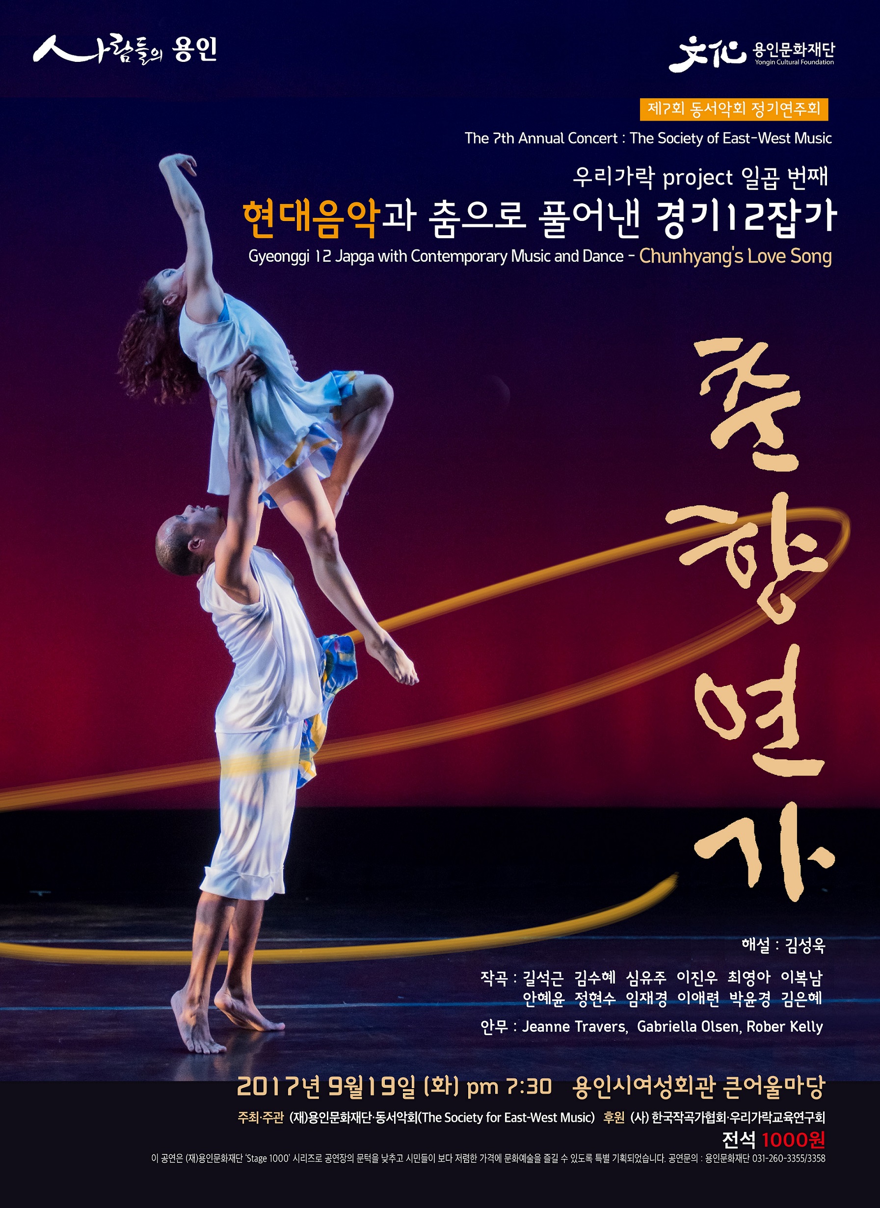 현대음악과 춤으로 풀어낸 신춘향전 전석1천원에 만나는 특별한 무대 소비환경뉴스 2017-09-07 08:54 가 본문내용 확대/축소 본문 현대음악과 춤으로 풀어낸 신춘향전 전석1천원에 만나는 특별한 무대현대음악과 춤으로 풀어낸 신춘향전 전석1천원에 만나는 특별한 무대 (재)용인문화재단(이사장 정찬민)은 동서악회와 공동주최로 진행하는 ‘춘향연가’를 오는 9월 19일 오후 7시 30분 용인시여성회관 큰어울마당에서 선보인다. 2009년에 창단된 동서악회는 서양음악 작곡가와 전문국악인이 주축이 되어 정기적으로 우리 음악을 연구하며 다양한 창작활동을 펼치고 있다. 이번 공연은 중요무형문화재 제 57호로 지정을 받은 경기지방의 토속 민요인 경기 12잡가를 12명의 작곡가들이 한 곡씩 위촉을 받아 진행하는 초연 무대이며 각 곡에 현대적 어법을 사용하여 민요, 판소리 등으로 다채롭게 재편성하였다. 특히 ‘집장가’, ‘평양가’, ‘방물가’ 등은 미국 남플로리다 주립대학교의 교수이자 현대무용가인 Jeanne Travers가 무대를 연출하여 우리 민요와 현대무용이 결합한 새로운 무대를 선보일 예정이다. 본 공연은 용인의 문화예술 저변 확대를 위해 저렴한 가격에 문화생활을 누릴 수 있도록 전석 1천원으로 특별 기획된 재단의 ‘스테이지1000’ 시리즈로 진행되며 예매 및 공연의 자세한 사항은 용인문화재단 CS센터(031-260-3355) 및 홈페이지(www.yicf.or.kr)를 통해 확인할 수 있다. ○ 일 정 : 2017년 9월 19일 오후 7시 30분 / 용인시여성회관 큰어울마당 ○ 티 켓 : 전석 1,000원 ○ 관람등급 : 초등학생 이상 ○ 공연시간 : 110분 ○ 문 의 : 용인문화재단 CS센터 031-260-3355,3358 / www.yicf.or.kr 좋아요 0 싫어요 0 소비환경뉴스 기자의 다른기사 보기 목록 댓글목록 이전글 경기도, 환경신기술개발 연구과제 공모 17.09.12 다음글 한국도자재단, ‘찾아가는 도자 전시‧체험 아카데미’ 운영 17.08.27