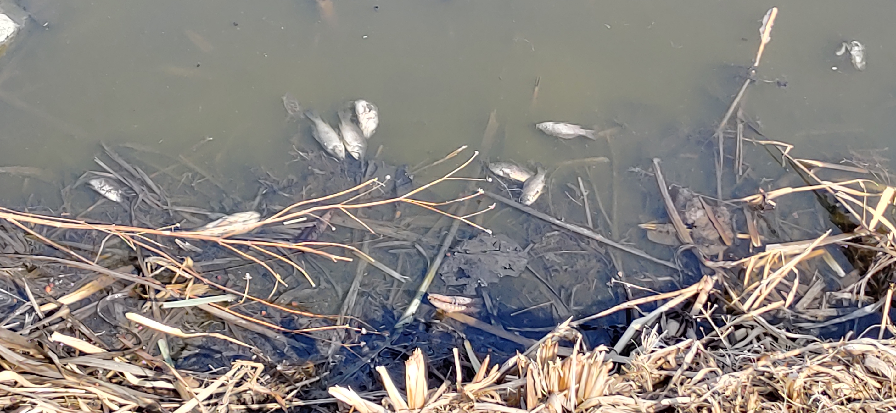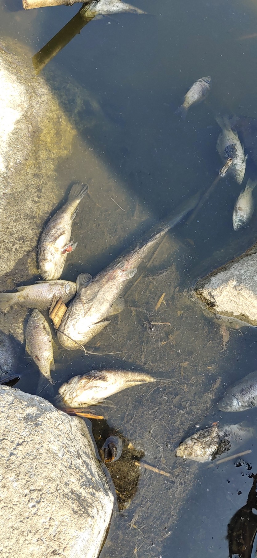 습지속에는 고기들이 다 죽어서 허연 배를 보이고 있다.