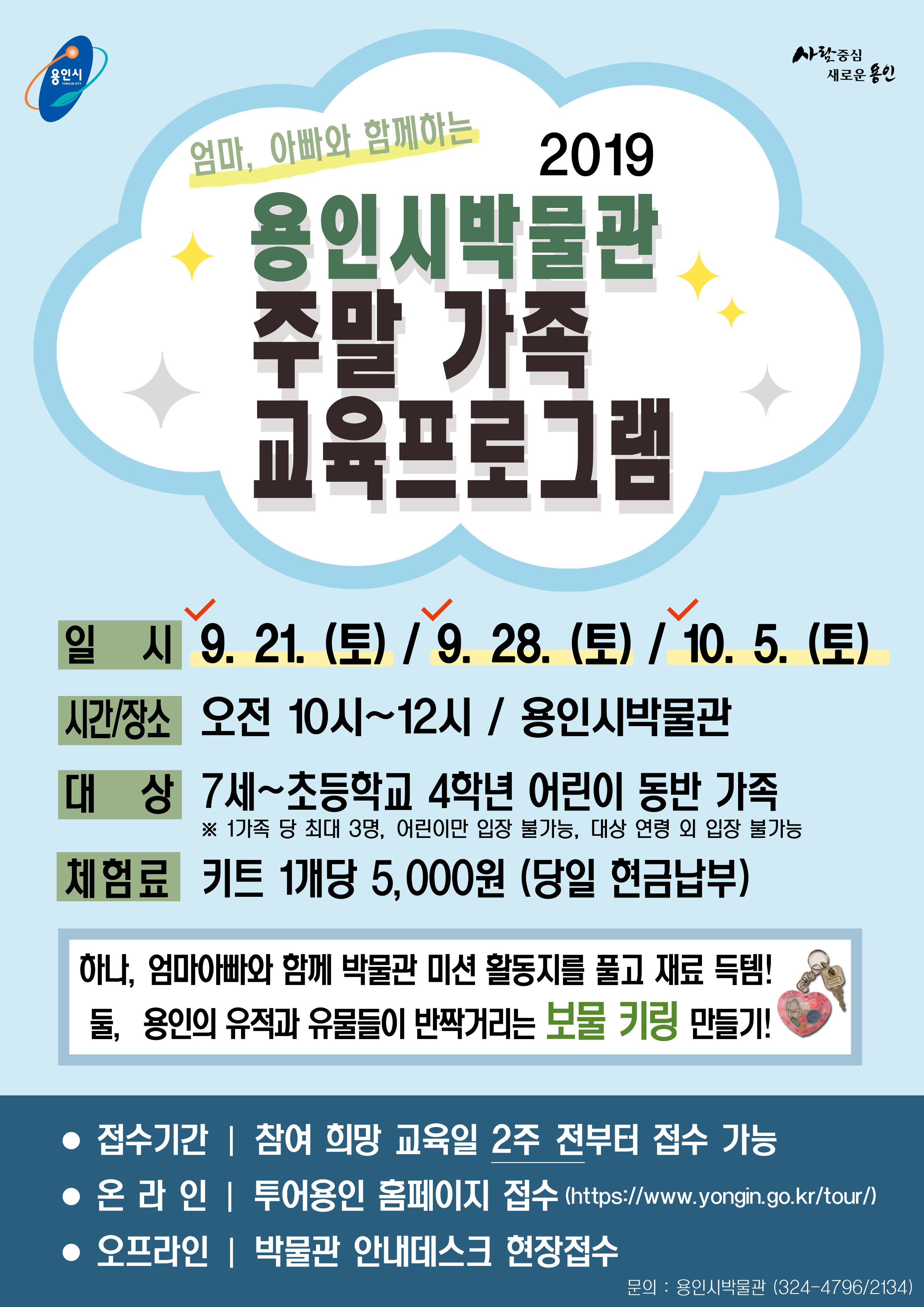 박물관서 용인의 역사 ․ 유물 체험할 가족 45팀 모집 본문 박물관서 용인의 역사 ․ 유물 체험할 가족 45팀 모집 용인시는 지역을 대표하는 역사적 인물과 유적 ․ 유물을 주제로 한 체험 교육 프로그램에 초등생 자녀를 둔 가족 45팀을 7일부터 선착순 모집한다. 부모와 자녀가 함께 박물관에서 다양한 미션을 하면서 쉽고 재미있게 역사를 이해할 수 있도록 도우려는 것이다. 신청을 하려면 투어용인 홈페이지(http://tour.yongin.go.kr/tour)에서 사전 접수하거나 박물관에서 바로 접수하면 된다. 참가자들은 21 ․ 28일, 10월5일 오전 10~12시 용인 보물지도를 보면서 박물관에 전시된 유물을 찾는 미션을 하고, 레진아트 기법을 활용해 시의 유물을 소재로 키링 만들기 체험을 하게 된다. 한 팀당 7~10세(초등 4년생) 어린이를 동반한 가족 3명까지 구성하고 재료비 5천원을 내야 한다. 회당 15팀씩 참여할 수 있다. 시 관계자는 “이번 프로그램을 통해 자녀들이 용인의 역사와 문화를 잘 이해하고 지역민으로서 자긍심을 고취하는 계기가 되기 바란다”고 말했다. 좋아요 0 싫어요 0 김경순 기자 2019-09-07 21:54 가 본문내용 확대/축소 목록 댓글목록 이전글 용인시, 직원 180여명 대상 실무 중심 법무교육 19.09.07 다음글 박물관서 용인의 역사 ․ 유물 체험할 가족 45팀 모집 19.09.07